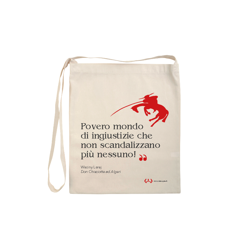 Borsa a tracolla in cotone biologico con stampa serigrafica a due colori di una delle più belle frasi del volume Don Chisciotte ad Algeri, di Waciny Larej.